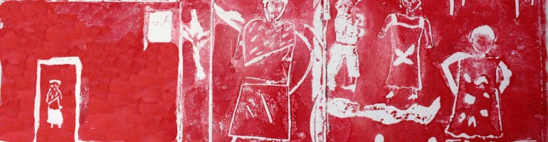 This group of girls produced a beautiful print for the exhibition about how communities can protect children’s rights. It shows a women who left her house one morning to attend a meeting in the village about the UNCRC. She was late attending and on her way she met two young children already on their way home. They were able to answer of the women’s questions and therefore shared their communities responsibility to implement their rights and help raise awareness of their importance. A really simple yet stunning print which shows clearly how communities and children can work together, this will look great in their class room!