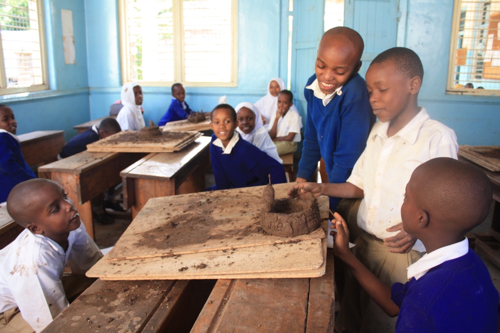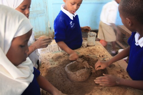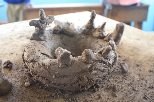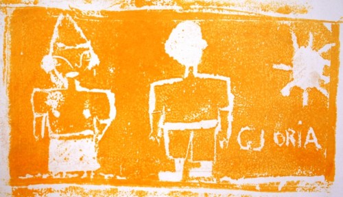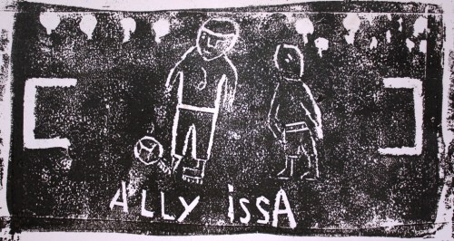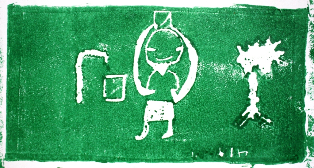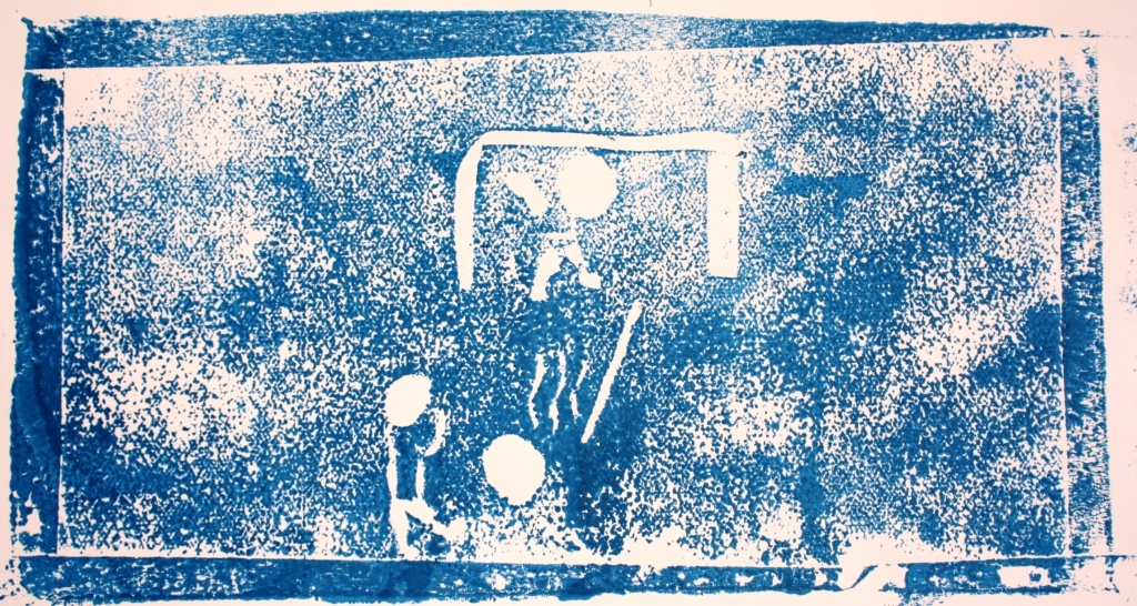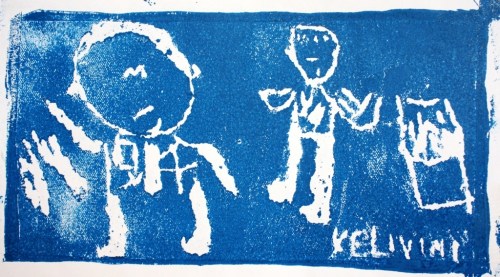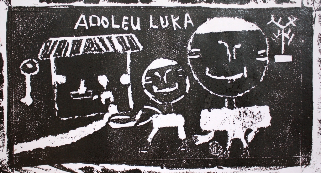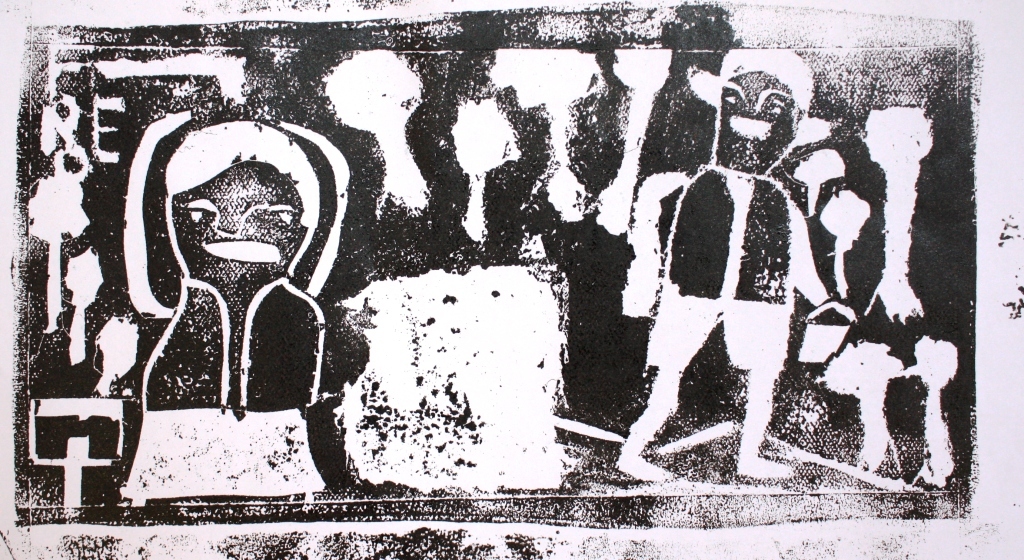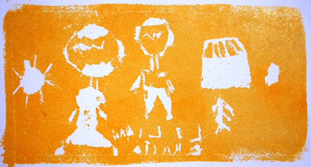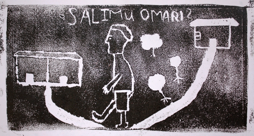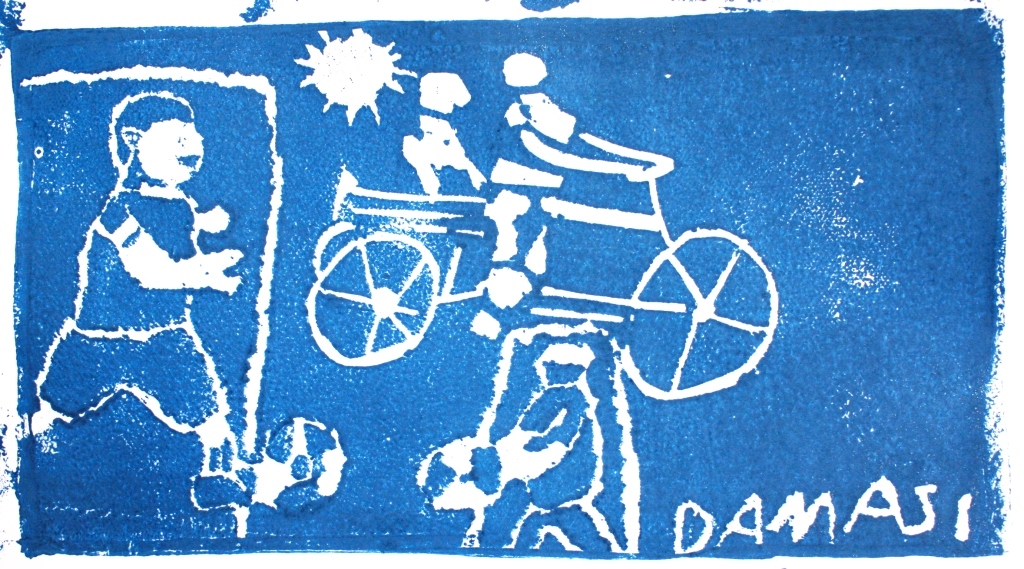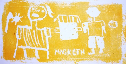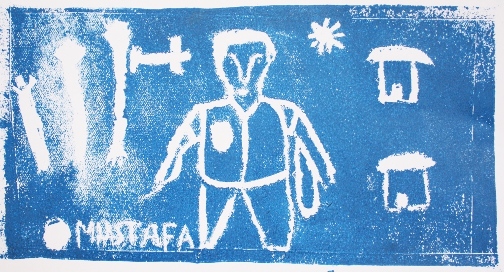 This group of girls produced a beautiful print for the exhibition about how communities can protect children’s rights. It shows a women who left her house one morning to attend a meeting in the village about the UNCRC. She was late attending and on her way she met two young children already on their way home. They were able to answer of the women’s questions and therefore shared their communities responsibility to implement their rights and help raise awareness of their importance. A really simple yet stunning print which shows clearly how communities and children can work together, this will look great in their class room!
